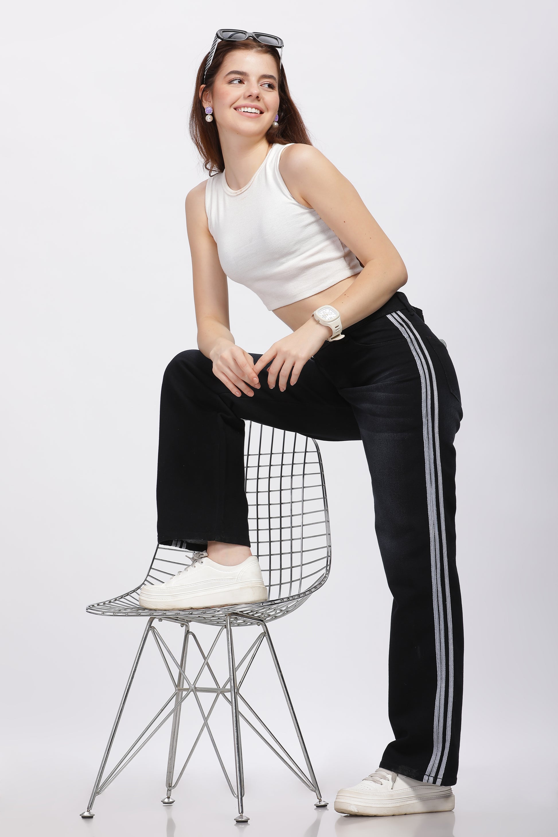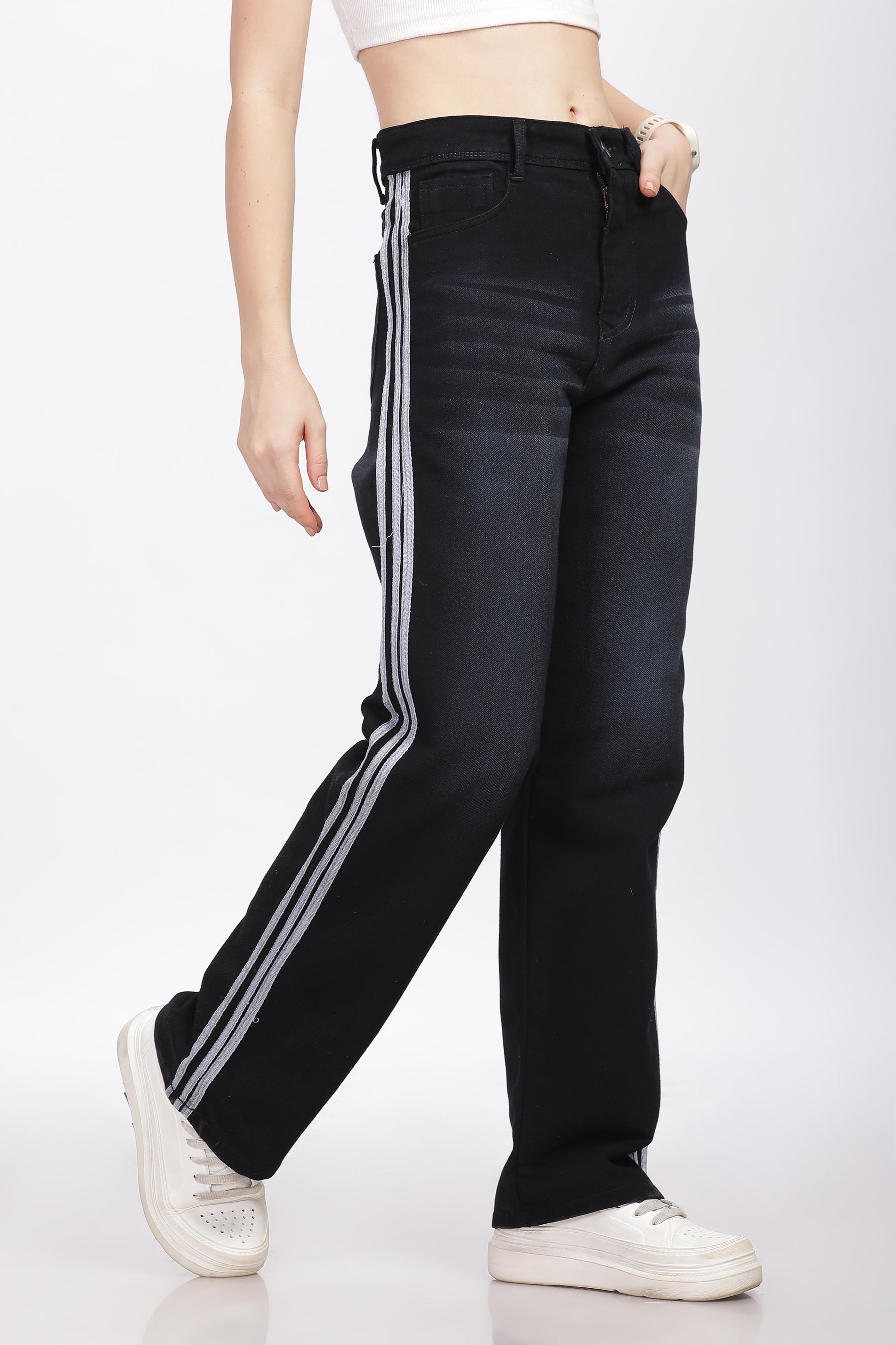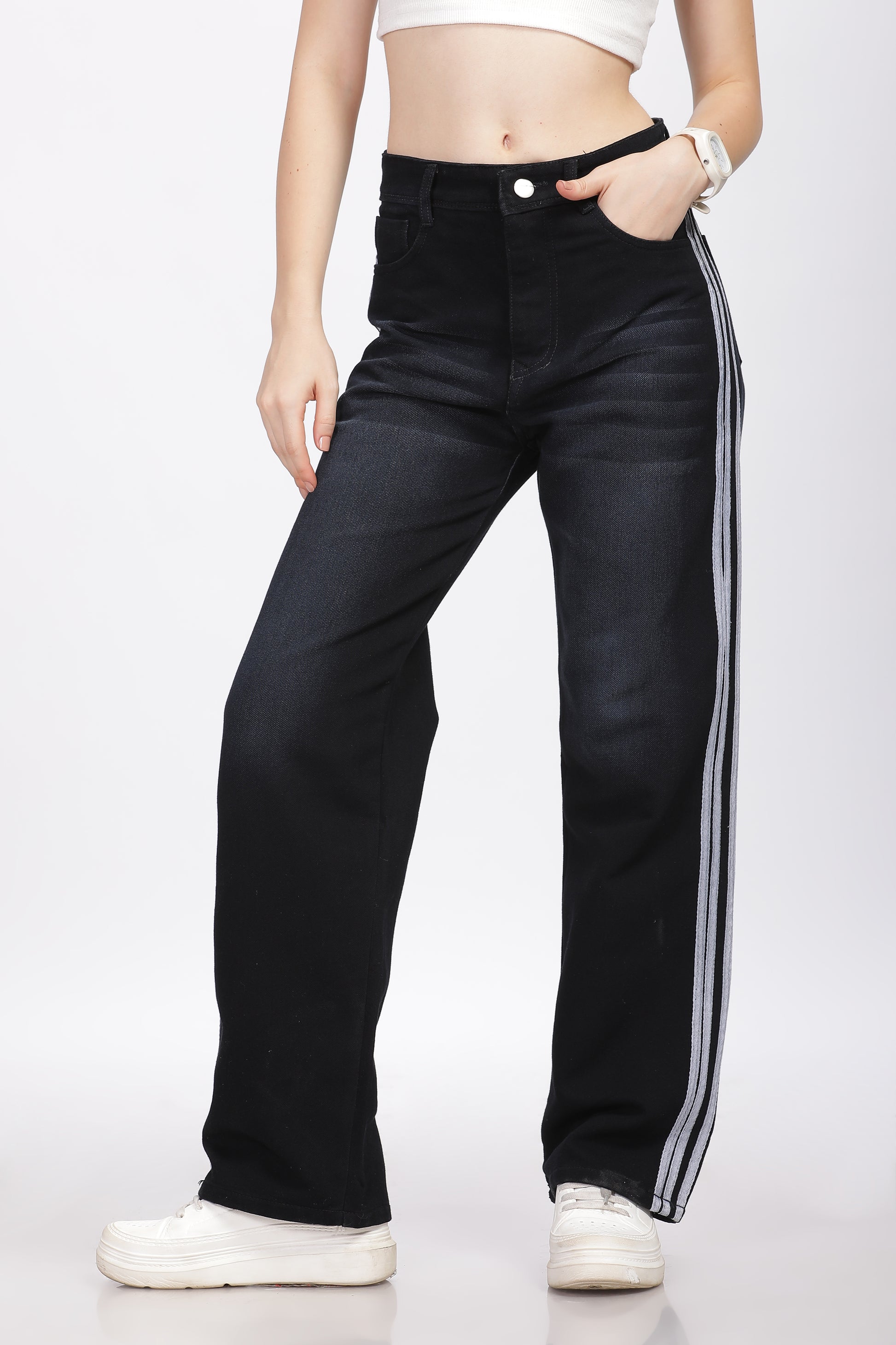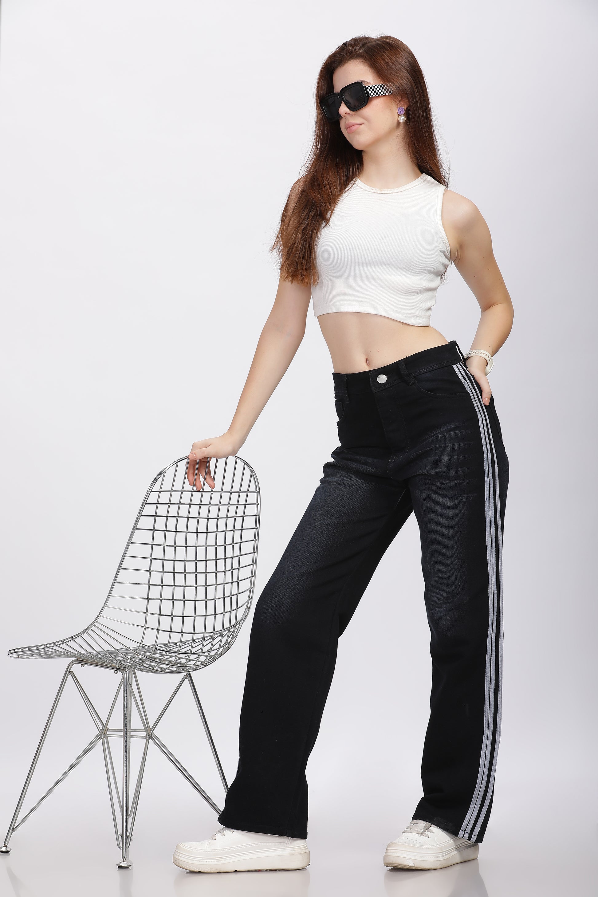 Effortless cool meets edgy detail.  These flowy high-waisted jeans are crafted for comfort & style. Delicate lace adds a touch of intrigue, perfect for day or night